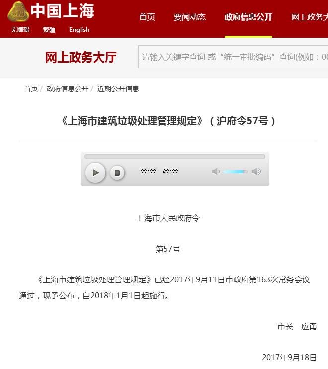 《上海市建筑垃圾處理管理規(guī)定》已經(jīng)2017年9月11日市政府第163次常務會議通過,現(xiàn)予公布,自2018年1月1日起施行。