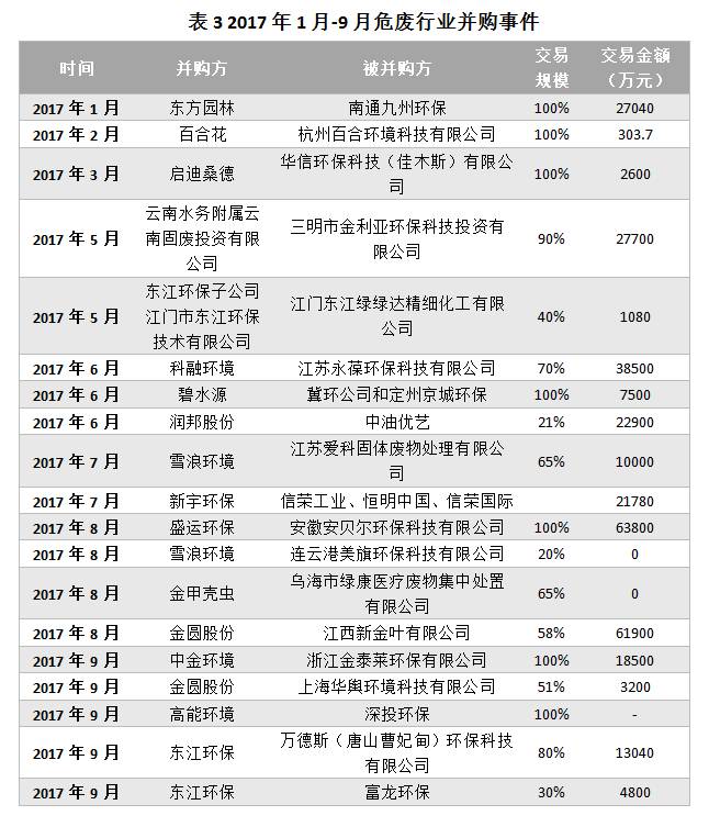 根據(jù)已有公開數(shù)據(jù)的不完全統(tǒng)計(jì),截至2017年9月,2017年危廢行業(yè)發(fā)起并購(gòu)行為19起起,累積交易金額32.46億元,并購(gòu)方既包括像東江環(huán)保、啟迪桑德、新宇環(huán)保這樣的“行業(yè)老兵”,也不乏碧水源、盛運(yùn)環(huán)保、中金環(huán)境等“后起之秀”,更有金圓股份等“跨界來(lái)者”。