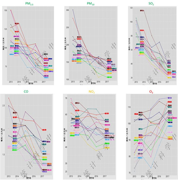 從統(tǒng)計(jì)數(shù)據(jù)來看,這些年來,政府的大氣污染防治卓有成效,上述城市六個(gè)常規(guī)監(jiān)測(cè)指標(biāo)中的4個(gè)指標(biāo)(PM2.5、PM10、SO2、CO)均呈現(xiàn)明顯下降趨勢(shì)。然而,與此同時(shí),另外兩個(gè)指標(biāo)卻乏善可陳,NO2改善不大(其中石家莊等9城市不降反升),而O3濃度甚至呈顯著上升趨勢(shì)。