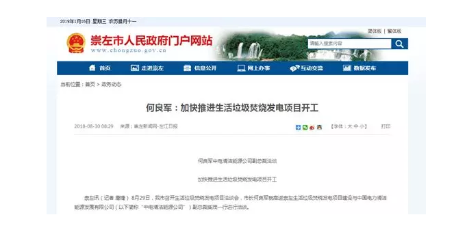 而根據(jù)政府官媒報(bào)道顯示,2018年8月29日,崇左市召開生活垃圾焚燒發(fā)電項(xiàng)目洽談會(huì),市長(zhǎng)何良軍就推進(jìn)崇左生活垃圾焚燒發(fā)電項(xiàng)目建設(shè)與中國(guó)電力清潔能源發(fā)展有限公司副總裁柴茂一行進(jìn)行洽談,旨在加快推進(jìn)生活垃圾焚燒發(fā)電項(xiàng)目開工。