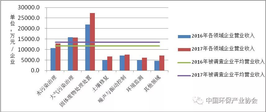 2017年,統(tǒng)計范圍內(nèi)企業(yè)營業(yè)收入總額11681.4億元,營業(yè)利潤總額1237.0億元。其中,環(huán)保業(yè)務(wù)營業(yè)收入6209.0億元,占比為53.2%,環(huán)保業(yè)務(wù)營業(yè)利潤804.5億元,占比為65.0%。同比來看,營業(yè)收入總額增長了17.5%,營業(yè)利潤降低了6.9%,其中,環(huán)保業(yè)務(wù)營業(yè)收入增長了17.9%,環(huán)保業(yè)務(wù)營業(yè)利潤增長了15.2%。具體到細(xì)分領(lǐng)域,與2016年相比,除大氣污染防治領(lǐng)域外,水污染防治、固廢處置與資源化、環(huán)境監(jiān)測領(lǐng)域企業(yè)的營業(yè)收入、環(huán)保業(yè)務(wù)營業(yè)收入、營業(yè)利潤、環(huán)保業(yè)務(wù)營業(yè)利潤均有不同程度的增長。
