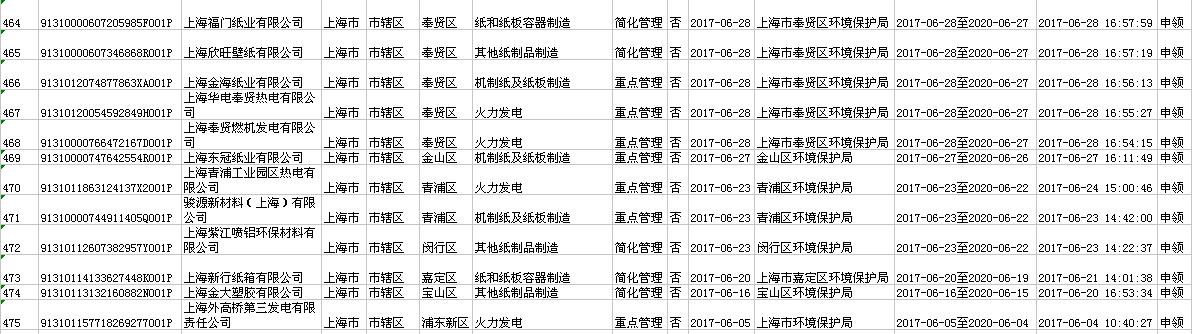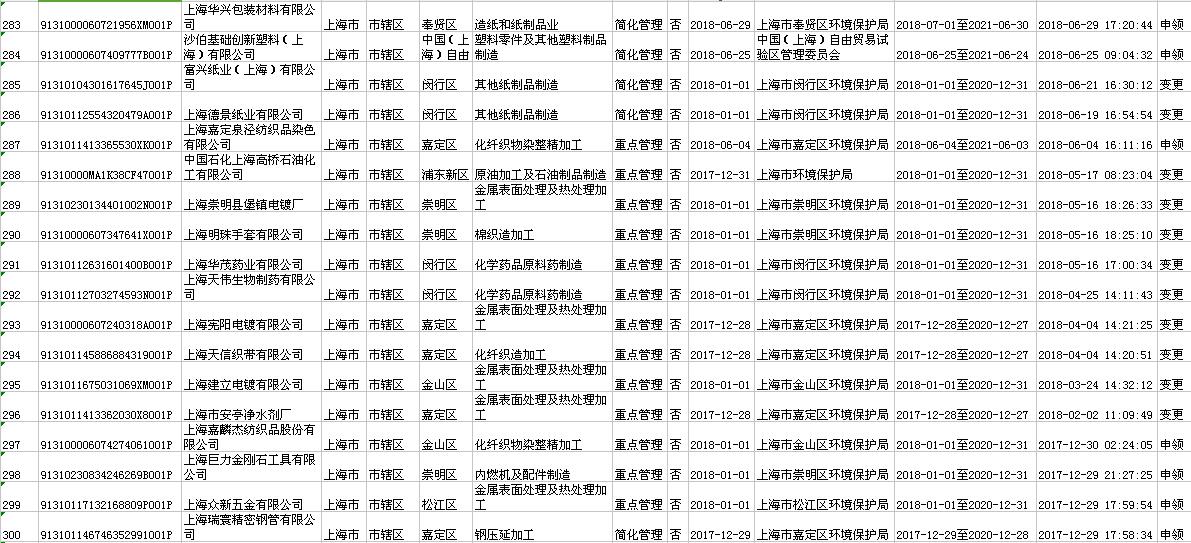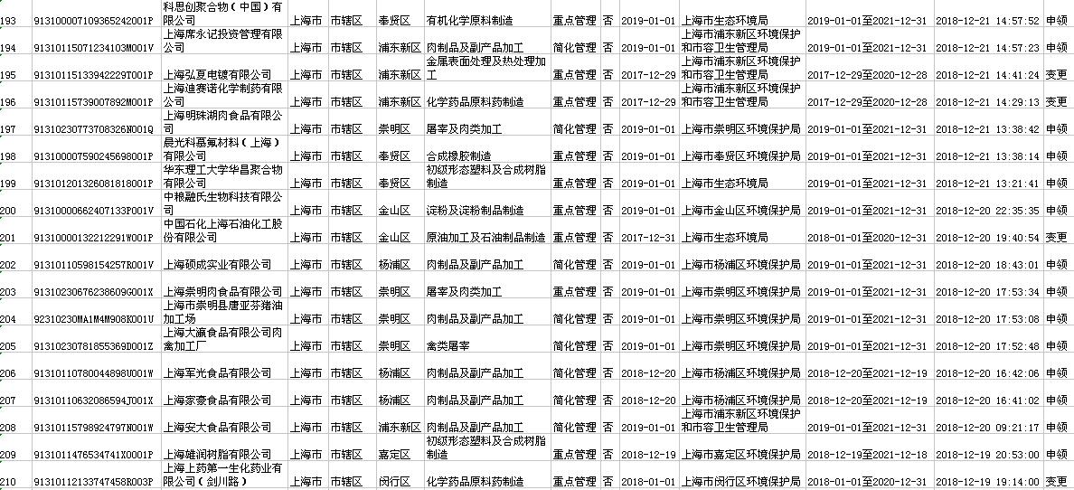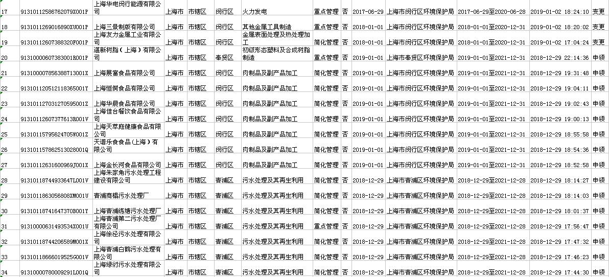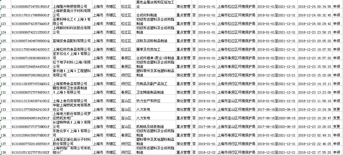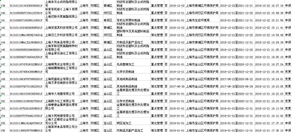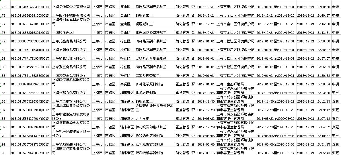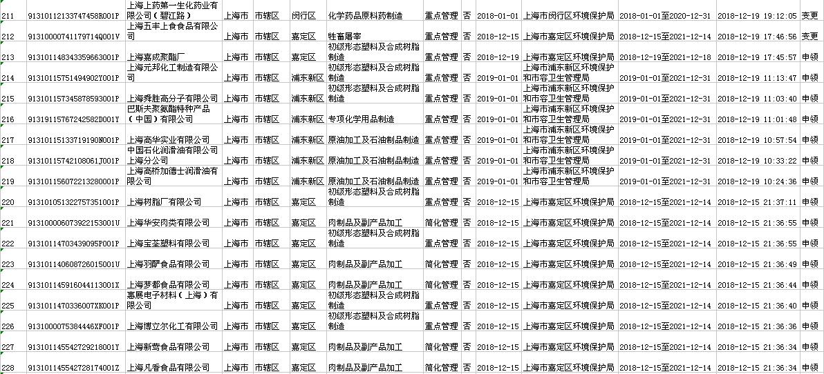 近日,上海市生態(tài)環(huán)境局發(fā)布了上海市排污許可證庫(kù)(截止2019年1月24日),匯總了475家具有排污許可證的企業(yè),詳情如下: