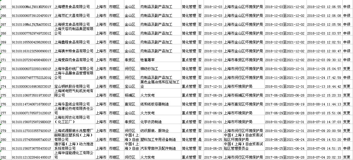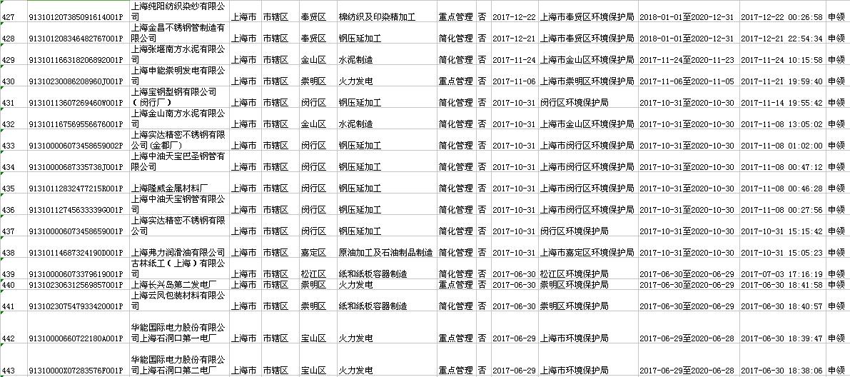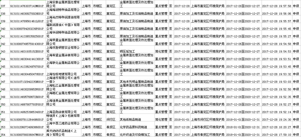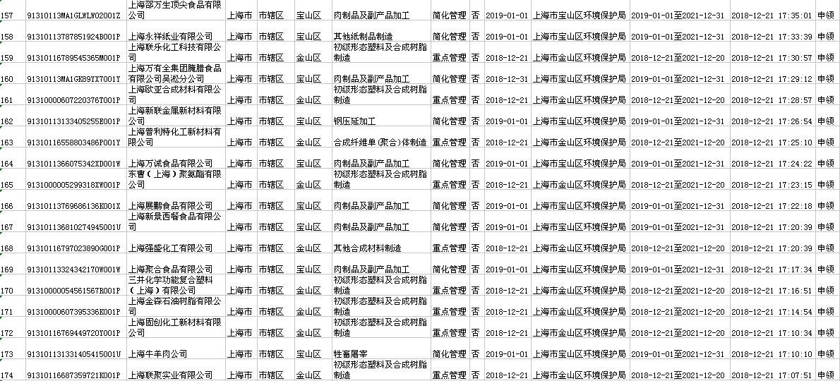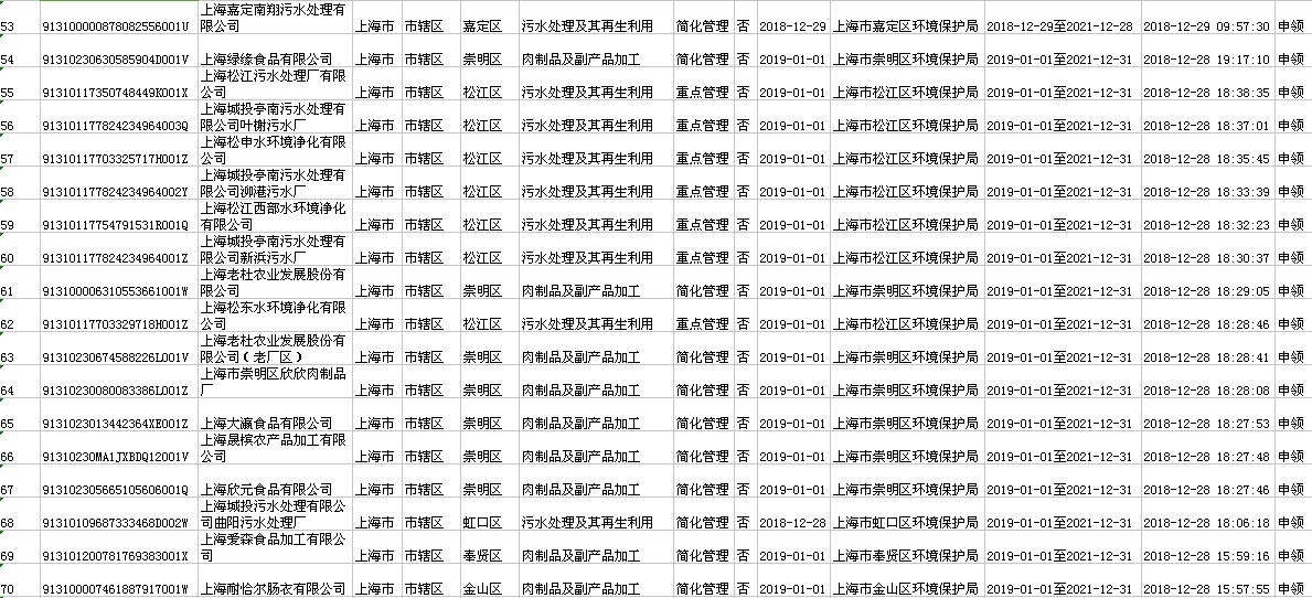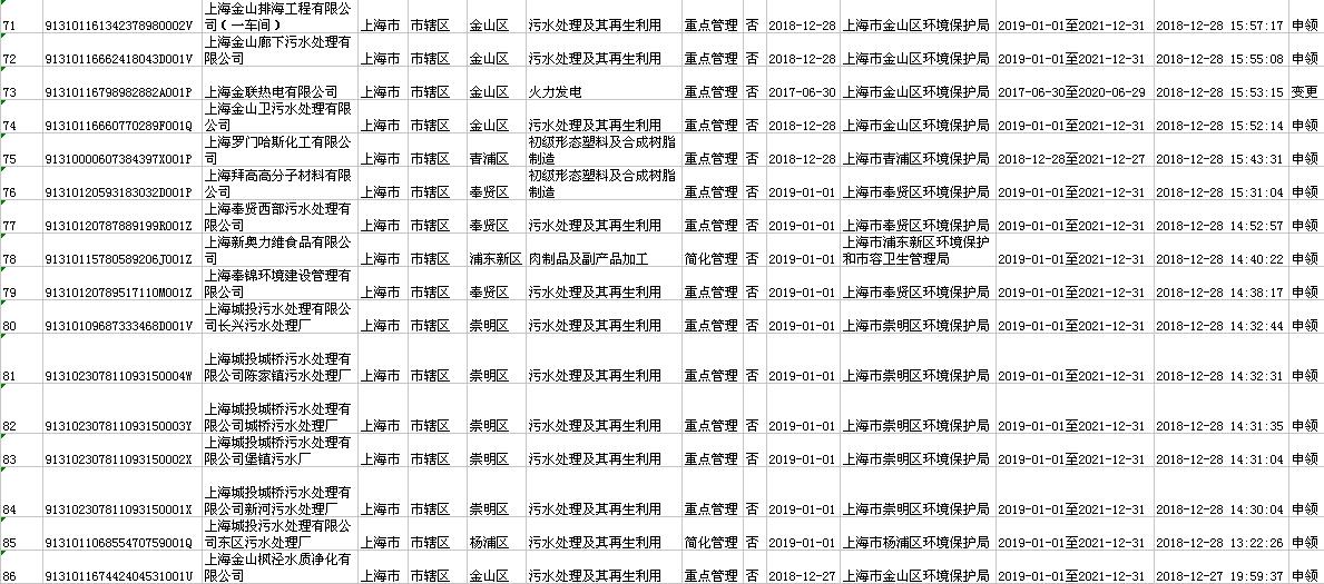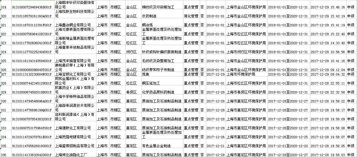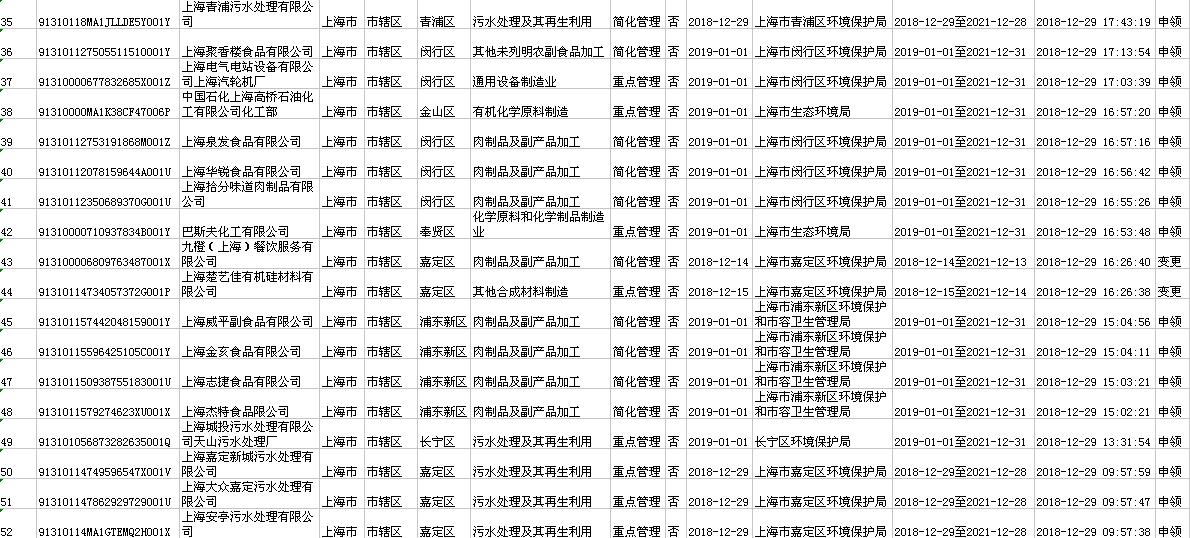 近日,上海市生態(tài)環(huán)境局發(fā)布了上海市排污許可證庫(kù)(截止2019年1月24日),匯總了475家具有排污許可證的企業(yè),詳情如下: