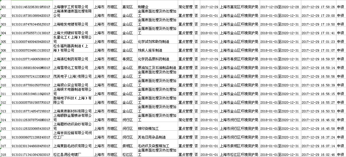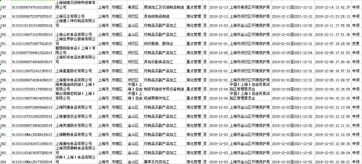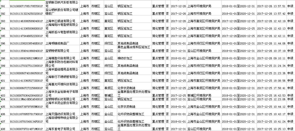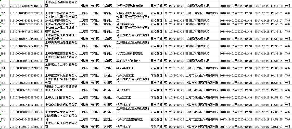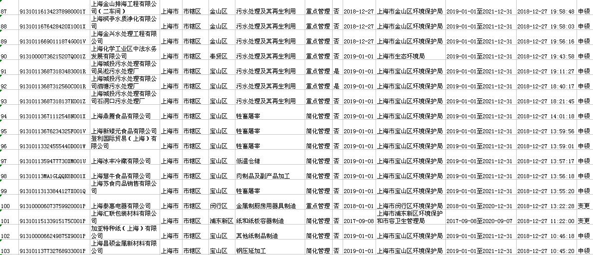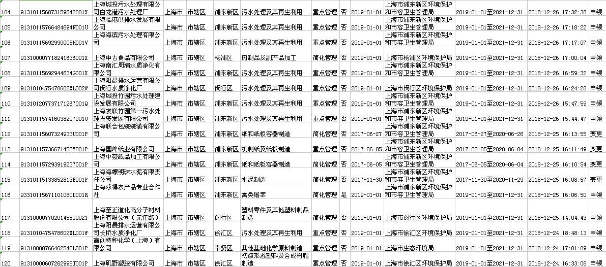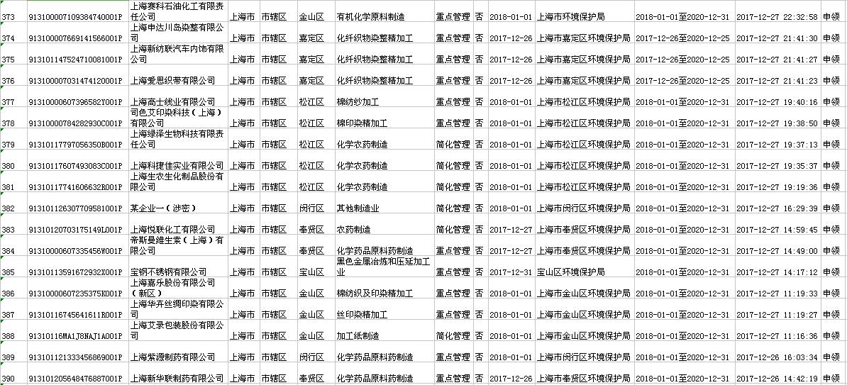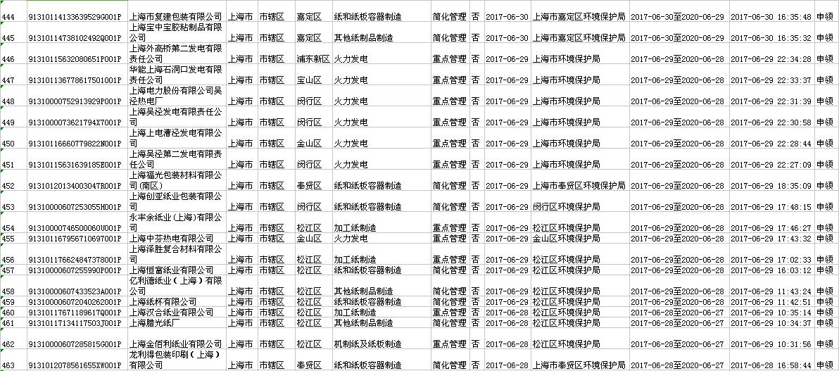 近日,上海市生態(tài)環(huán)境局發(fā)布了上海市排污許可證庫(kù)(截止2019年1月24日),匯總了475家具有排污許可證的企業(yè),詳情如下: