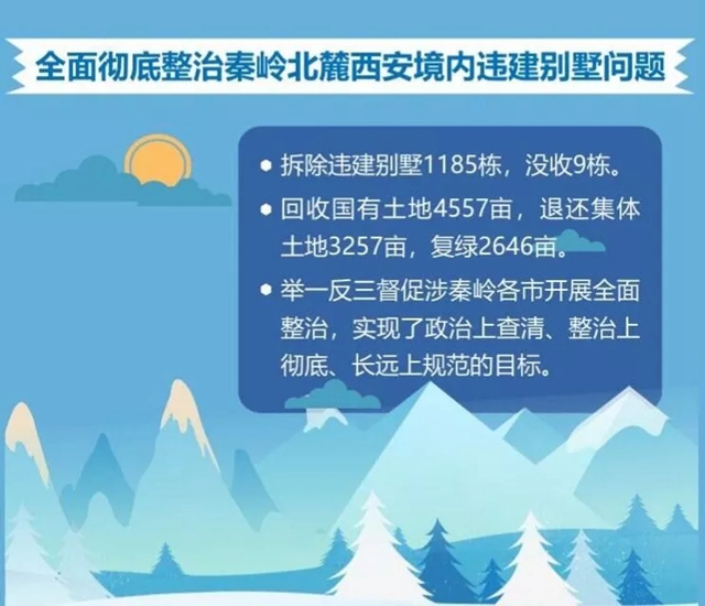 全面徹底整治秦嶺北麓西安境內(nèi)違建別墅問題,拆除違建別墅1185棟,沒收9 棟,回收國有土地4557畝,退還集體土地3257畝,復綠2646畝。