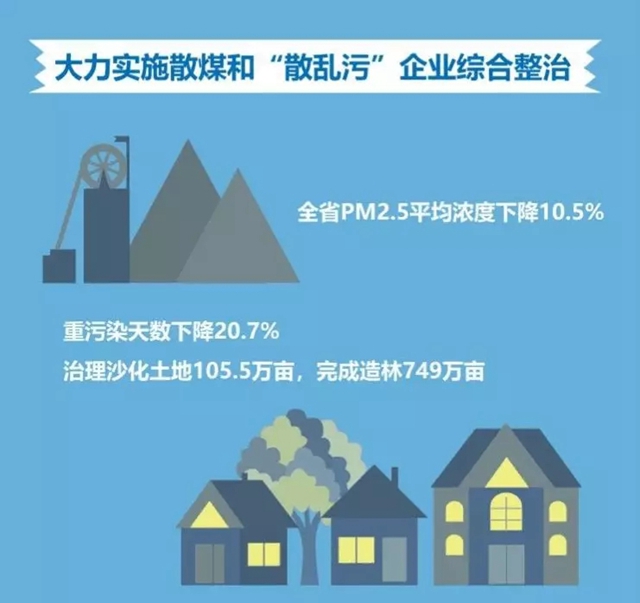 大力實施散煤和“散亂污”企業(yè)綜合整治,強化汾渭平原聯(lián)防聯(lián)控,全省PM2.5平均濃度下降10.5%,重污染天數(shù)下降20.7%。