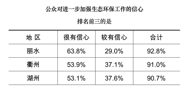 88.7%的公眾對本地黨委政府進一步加強生態(tài)建設(shè)和環(huán)境保護工作、建設(shè)美麗浙江充滿信心,全省五個地區(qū)對進一步加強生態(tài)環(huán)保工作的信心率超過九成,其中麗水最高。
