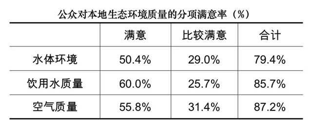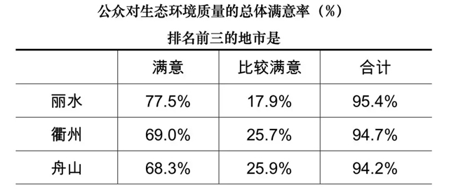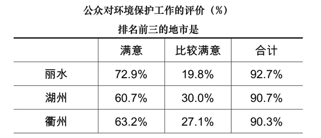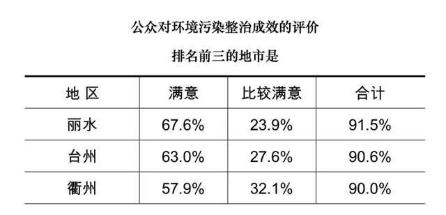 87.1%的公眾對生態(tài)環(huán)境整治成效表示滿意,麗水、臺州和衢州的公眾對生態(tài)環(huán)境整治成效的滿意率超過九成。
