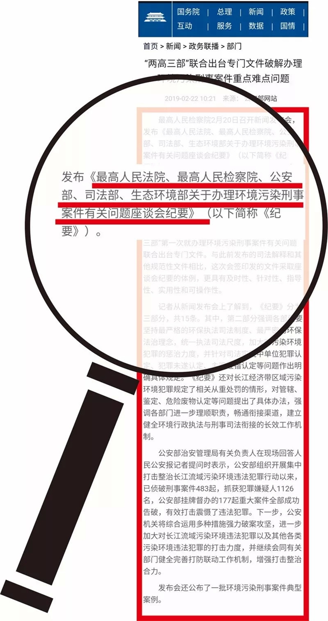 本月20日,“五大部門”,即最高人民法院、最高人民檢察院、公安部、司法部、生態(tài)環(huán)境部聯(lián)合發(fā)布了《關(guān)于辦理環(huán)境污染刑事案件有關(guān)問題座談會紀要》,明確了十一項當前辦理環(huán)境污染刑事案件中的重點難點問題判定,強調(diào)了各部門“要堅持最嚴格的環(huán)保司法制度、最嚴密的環(huán)保法治理念,統(tǒng)一執(zhí)法司法尺度,加大對環(huán)境污染犯罪的懲治力度。”其中特別指出:對重污染天氣預警期間,違反國家規(guī)定,超標排放二氧化硫、氮氧化物,受過行政處罰后又實施上述行為或者具有其他嚴重情節(jié)的,按照“兩高三部” 《關(guān)于辦理環(huán)境污染刑事案件有關(guān)問題座談會紀要》,可以污染環(huán)境罪追究刑事責任。認定單位犯罪時,要區(qū)分“直接負責的主管人員”和“其他直接責任人員”,重點打擊出資者、經(jīng)營者和主要獲利者。對于情節(jié)惡劣、社會反映強烈的環(huán)境污染犯罪,“不得適用緩刑、免予刑事處罰”!