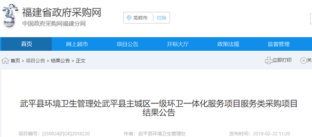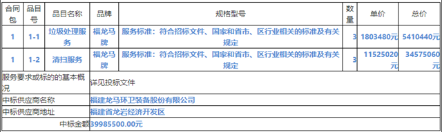 福建省武平縣主城區(qū)一級(jí)環(huán)衛(wèi)一體化服務(wù)項(xiàng)目服務(wù)類采購(gòu)項(xiàng)目發(fā)布結(jié)果公告,福建龍馬環(huán)衛(wèi)裝備股份有限公司成為中標(biāo)的社會(huì)資本方,中標(biāo)金額為3998.55萬。