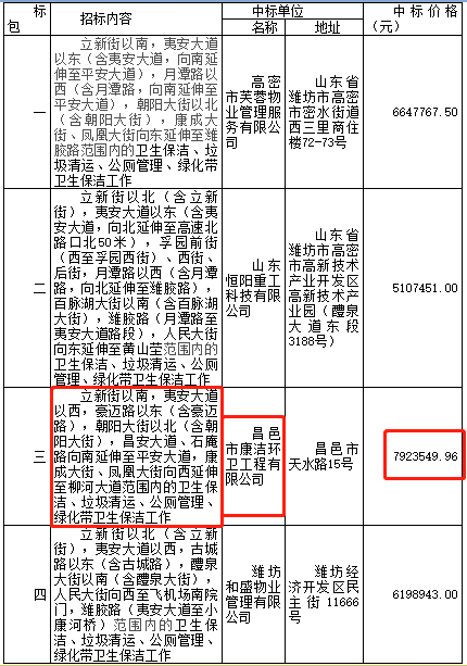 山東濰坊高密市2019-2021年度城區(qū)環(huán)衛(wèi)作業(yè)項目發(fā)布中標公告,昌邑市康潔環(huán)衛(wèi)工程有限公司獲得三標段,中標金額792萬。
