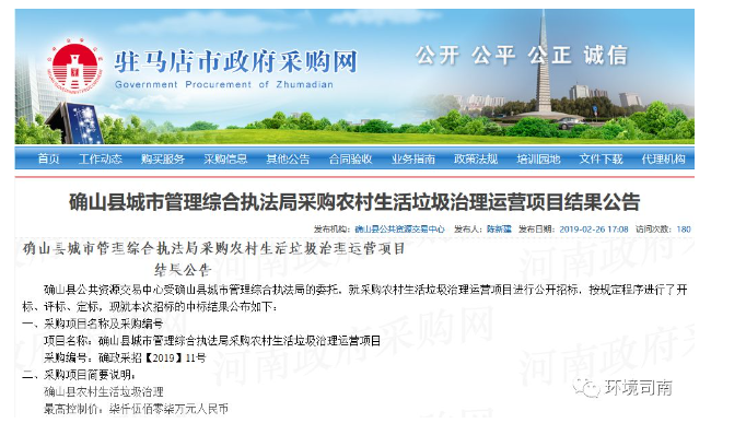 確山縣農(nóng)村生活垃圾治理運(yùn)營(yíng)項(xiàng)目中標(biāo)信息