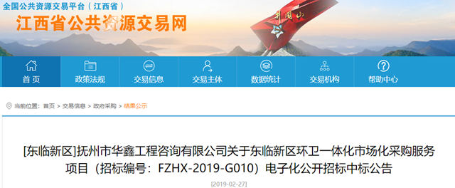 江西省撫州市東臨新區(qū)環(huán)衛(wèi)一體化項(xiàng)目發(fā)布中標(biāo)公告,勁旅環(huán)境科技有限公司成為項(xiàng)目的中標(biāo)社會(huì)資本方,中標(biāo)金額1360.17萬(wàn),服務(wù)期限:自2019年3月1日起至2019年12月31日。