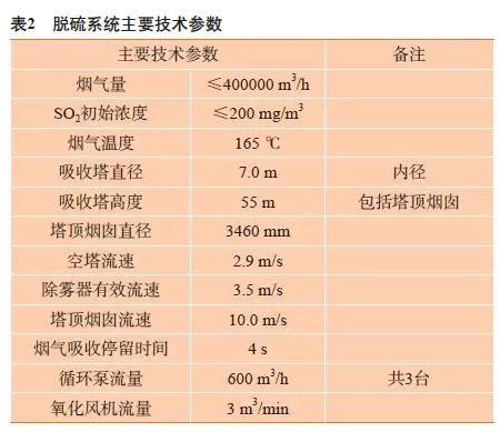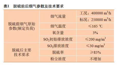 新建的130 T高溫超高壓高爐煤氣鍋爐排放的煙氣含硫最高200 mg/m3,粉塵5 mg/m3。根據(jù)當(dāng)前國家環(huán)保的排放限值是:SO2 30 mg/m3和粉塵5 mg/m3,因此需要對排放煙氣設(shè)計(jì)脫硫方案(見表1),使排放煙氣SO2含量降到30 mg/m3以下,同時(shí)脫硫過程不得增加粉塵濃度,并且保證脫硫機(jī)組年穩(wěn)定運(yùn)行時(shí)間≥8400 h,除霧器出口機(jī)械水含量≤75 mg/m3。