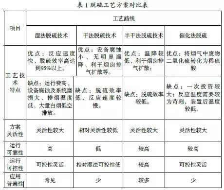 通過比較工藝方案靈活性、工藝技術(shù)的先進(jìn)性和可靠性、主要技術(shù)經(jīng)濟(jì)指標(biāo)、節(jié)能、環(huán)保、安全等方面,對各種脫硫工藝方案進(jìn)行對比,見表1。