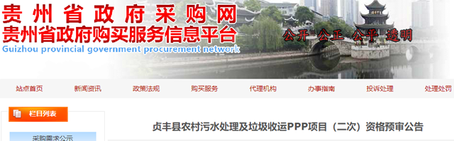 貴州省貞豐縣農(nóng)村污水處理及垃圾收運(yùn)PPP項(xiàng)目發(fā)布第二次資格預(yù)審公告。