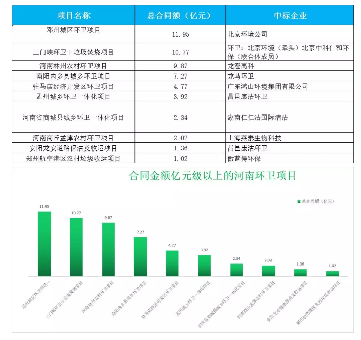有的企業(yè)專攻大城市重點城區(qū)的一體化項目,比如北京環(huán)衛(wèi)集團、龍馬環(huán)衛(wèi)、龍澄高科、昌邑康潔環(huán)衛(wèi)等,這些項目服務(wù)期限長,年服務(wù)費和總合同金額也大,少則1-2億元,多則10億元以上。在大項目開拓上,北京環(huán)衛(wèi)集團略勝一籌,旗下的北京環(huán)境公司斬獲鄧州城區(qū)環(huán)衛(wèi)項目和三門峽環(huán)衛(wèi)+垃圾焚燒項目,總合同金額累計達22.72億元,按照本文開端提到釋放60億元的訂單,僅北京環(huán)衛(wèi)集團一家,便占據(jù)河南三分之一的市場。