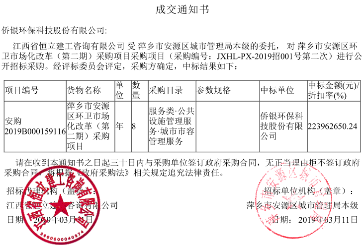 原標(biāo)題:僑銀環(huán)保中標(biāo)2.24億江西萍鄉(xiāng)安源區(qū)環(huán)衛(wèi)市場化項目