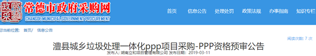 2019年3月11日,湖南常德澧縣城鄉(xiāng)垃圾處理一體化PPP項(xiàng)目發(fā)布資格預(yù)審公告。