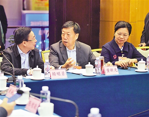 左圖 3月10日,全國政協(xié)民建界別在駐地舉行小組會議。會前,全國政協(xié)委員蒙曉靈、董新光、賴明勇(從右至左)就“如何探索生態(tài)優(yōu)先、綠色發(fā)展為導向的新路子”展開交流。 本報記者 高興貴攝