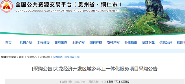 貴州省大龍經(jīng)濟(jì)開發(fā)區(qū)城鄉(xiāng)環(huán)衛(wèi)一體化服務(wù)項(xiàng)目發(fā)布采購(gòu)公告。項(xiàng)目采購(gòu)預(yù)算1855.59萬(wàn)/年,服務(wù)期限20年,總金額約3.7億。