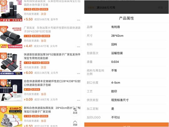 在阿里巴巴的1688采購批發(fā)平臺上,記者也得到了相關印證。通過對關鍵詞“快遞袋”的搜索,數(shù)十家生產廠家排列開來,選取用按銷量排序,最高的則成交累計成交300余萬包,其快遞袋的明顯來源為“回料”,即回收料。