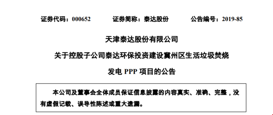 7月25日,泰達(dá)股份(證券代碼:000652)發(fā)布公告稱,為進(jìn)一步擴(kuò)大生態(tài)環(huán)保產(chǎn)業(yè)規(guī)模,控股子泰達(dá)環(huán)保擬投資建設(shè)河北省衡水市冀州區(qū)生活垃圾焚燒發(fā)電PPP項目(以下簡稱“冀州項目”或“項目”)。項目總投資金額約為26,860萬元,位于冀州區(qū)城區(qū)西南3公里,衡水寶潔生活垃圾處理場西側(cè),占地80畝,由泰達(dá)...