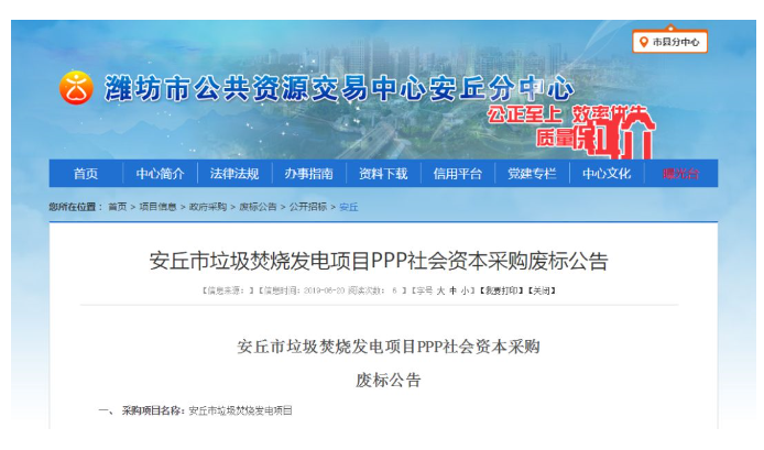 近日,安丘市垃圾焚燒發(fā)電PPP社會(huì)資本采購(gòu)項(xiàng)目發(fā)布廢標(biāo)公告。公告稱(chēng),截至開(kāi)標(biāo)時(shí)間,有效投標(biāo)人不足法定開(kāi)標(biāo)數(shù)量,項(xiàng)目流標(biāo)。據(jù)中國(guó)環(huán)聯(lián)網(wǎng)了解,在今年4月1日,該項(xiàng)目發(fā)布預(yù)審公告;4月26日,公布預(yù)審結(jié)果,稱(chēng)經(jīng)資格預(yù)審評(píng)審委員會(huì)評(píng)審,通過(guò)本次資格預(yù)審的申請(qǐng)人多于(含)3家;5月16日,該項(xiàng)目發(fā)布招標(biāo)公告;...