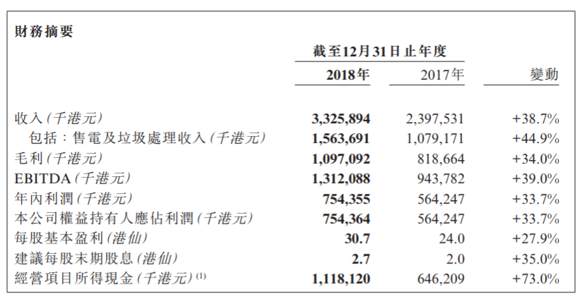 近日,粵豐環(huán)保(01381)發(fā)布2018年度業(yè)績,該集團(tuán)于年內(nèi)收入為33.26億港元,同比增長38.7%。毛利為10.97億港元,同比增長34.0%。公司權(quán)益持有人應(yīng)占利潤為7.54億港元,同比增長33.7%。每股基本盈利為30.7港仙,擬派發(fā)末期股息每股2.7港仙。公告顯示,年內(nèi)該集團(tuán)無害化處理垃...