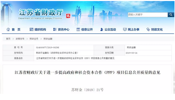 江蘇省財(cái)政廳關(guān)于進(jìn)一步提高政府和社會(huì)資本合作(PPP)項(xiàng)目信息公開(kāi)質(zhì)量的意見(jiàn)蘇財(cái)金〔2019〕21號(hào)各市、縣財(cái)政局:為深入貫徹落實(shí)國(guó)務(wù)院辦公廳《關(guān)于推進(jìn)社會(huì)公益事業(yè)建設(shè)領(lǐng)域政府信息公開(kāi)的意見(jiàn)》(國(guó)辦發(fā)﹝2018﹞10號(hào))、財(cái)政部《政府和社會(huì)資本合作(PPP)綜合信息平臺(tái)信息公開(kāi)管理暫行辦法》(財(cái)金﹝...