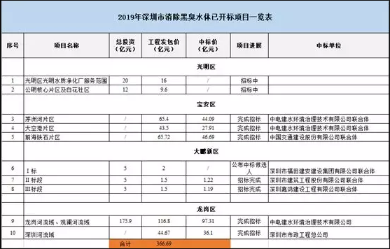 根據(jù)公開資料不完全統(tǒng)計(jì),今年來深圳市共放出10個(gè)黑臭水體項(xiàng)目,涉及光明區(qū)、寶安區(qū)、大鵬新區(qū)、龍崗區(qū)等四個(gè)區(qū),累積工程發(fā)包價(jià)為366.69億,這些大項(xiàng)目大部分采用EPC模式進(jìn)行。統(tǒng)計(jì)結(jié)果還顯示,每個(gè)項(xiàng)目,在開標(biāo)時(shí)都吸引了一二十家企業(yè)參與,經(jīng)過激烈競(jìng)爭后,已經(jīng)完成招標(biāo)的項(xiàng)目大部分花落國資之手。 近期,中...