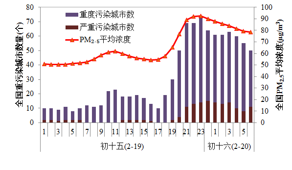 2019年2月19日至20日6時(shí)全國(guó)逐小時(shí)重污染城市數(shù)量及PM2.5濃度(圖片來源:生態(tài)環(huán)境部)生態(tài)環(huán)境部有關(guān)負(fù)責(zé)人介紹說,元宵節(jié)期間,337個(gè)地級(jí)及以上城市中有17個(gè)城市出現(xiàn)了重度及以上污染,其中重度污染16個(gè),綏化市出現(xiàn)嚴(yán)重污染。與前一日相比,重度及以上污染城市數(shù)量增加14個(gè)。19日白天,23個(gè)...