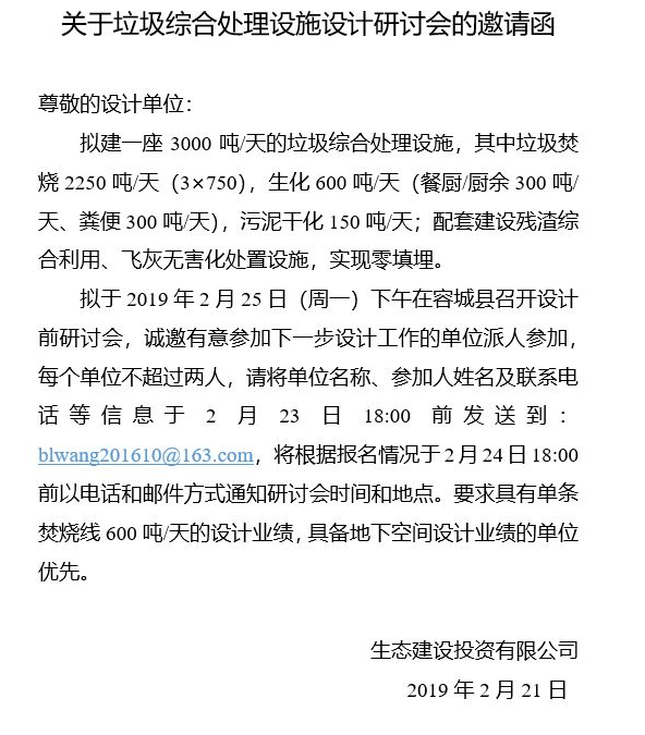 河北省容城縣擬建一座3000噸/日垃圾綜合處理設(shè)施,擬于2月25日(周一)下午邀請(qǐng)具有相關(guān)資質(zhì)的設(shè)計(jì)單位參加設(shè)計(jì)前研討會(huì)。有意參與的單位可將單位名稱、參加人姓名及聯(lián)系方式發(fā)至下圖中聯(lián)系郵箱,或致電13901170916(李先生)咨詢、報(bào)名。研討會(huì)時(shí)間及地點(diǎn)將在報(bào)名后統(tǒng)一通知。