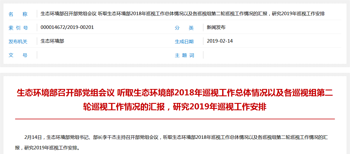 2月14日,生態(tài)環(huán)境部黨組書記、部長(zhǎng)李干杰主持召開部黨組會(huì)議,聽取生態(tài)環(huán)境部2018年巡視工作總體情況以及各巡視組第二輪巡視工作情況的匯報(bào),研究2019年巡視工作安排。會(huì)議指出,巡視工作是落實(shí)全面從嚴(yán)治黨主體責(zé)任、加強(qiáng)領(lǐng)導(dǎo)班子和干部隊(duì)伍建設(shè)的重要抓手。黨的十九大以來,生態(tài)環(huán)境部黨組研究制定巡視工作五...