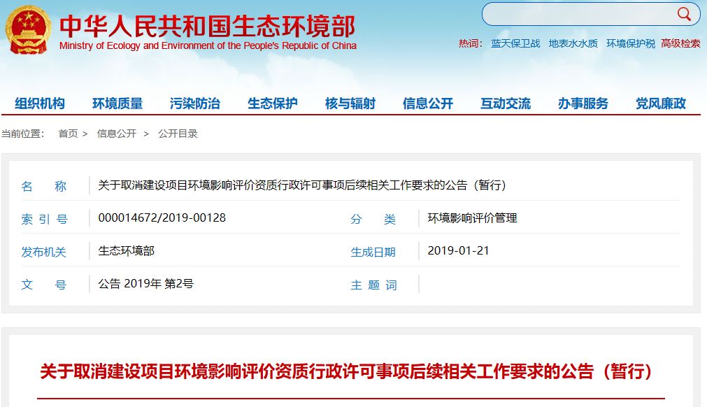 關(guān)于取消建設(shè)項(xiàng)目環(huán)境影響評(píng)價(jià)資質(zhì)行政許可事項(xiàng)后續(xù)相關(guān)工作要求的公告(暫行) 《全國(guó)人民代表大會(huì)常務(wù)委員會(huì)關(guān)于修改〈中華人民共和國(guó)勞動(dòng)法〉等七部法律的決定》(中華人民共和國(guó)主席令第二十四號(hào))已于2018年12月29日公布施行,對(duì)《中華人民共和國(guó)環(huán)境影響評(píng)價(jià)法》作出修改,取消了建設(shè)項(xiàng)目環(huán)境影響評(píng)價(jià)資質(zhì)行...