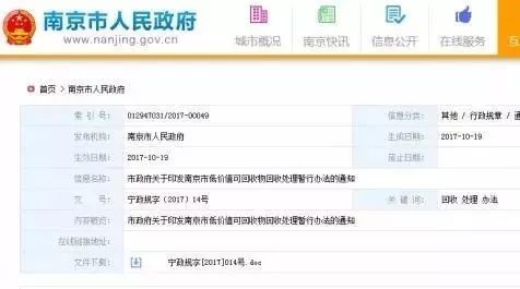 文章導(dǎo)讀 10月19日,南京市政府公布了《南京市低價值可回收物回收處理暫行辦法》,根據(jù)辦法規(guī)定,城市管理部門負責(zé)管理轄區(qū)內(nèi)低價值可回收物回收工作,并通過政府采購方式向企業(yè)購買低價值可回收物的回收、處理服務(wù)。辦法自今年11月20日起施行,有效期3年。 《辦法》公布后,南京成為繼廣州之后,又一個出臺有關(guān)...