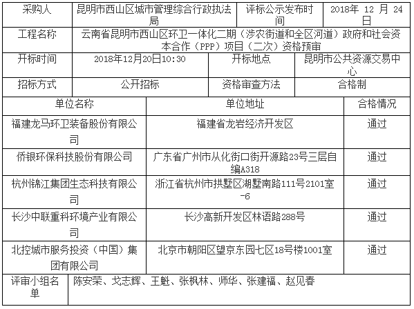 云南省昆明市西山區(qū)環(huán)衛(wèi)一體化二期(涉農(nóng)街道和全區(qū)河道)政府和社會資本合作(PPP)項目(二次)資格預(yù)審結(jié)果公示,公示顯示福建龍馬環(huán)衛(wèi)裝備股份有限公司、僑銀環(huán)??萍脊煞萦邢薰尽⒑贾蒎\江集團(tuán)生態(tài)科技有限公司、長沙中聯(lián)重科環(huán)境產(chǎn)業(yè)有限公司、北控城市服務(wù)投資(中國)集團(tuán)有限公司通過資格預(yù)審。具體內(nèi)容如下:...