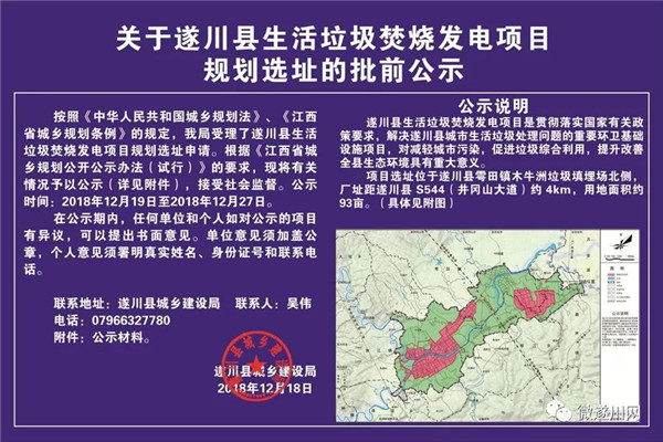 日前遂川縣人民政府發(fā)布了《關(guān)于遂川縣生活垃圾焚燒發(fā)電項目規(guī)劃選址的批前公示》,公司現(xiàn)實遂川縣生活垃圾焚燒發(fā)電項目選址位于遂川縣雩田鎮(zhèn)木牛洲垃圾填埋場北側(cè),廠址距遂川縣S544(井岡山大道)約4km,用地面積約93畝。具體公司內(nèi)容如下: