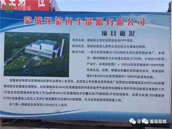 最新消息!安徽蒙城縣生活垃圾焚燒發(fā)電項目將于明年7月開始垃圾焚燒調(diào)試,明年年底正式投入使用。蒙城縣生活垃圾焚燒發(fā)電PPP項目于2017年9月12日簽署PP協(xié)議。項目總投資為33049萬元。項目占地約70畝(一期工程),項目建設(shè)于2018年4月28日開工。項目主要建設(shè)內(nèi)容為一座日處理1050噸的生活垃...