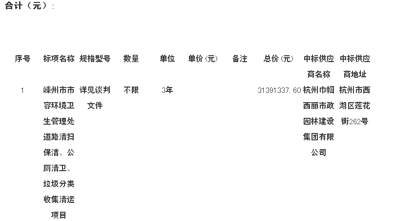 嵊州市公共資源交易中心關(guān)于嵊州市市容環(huán)境衛(wèi)生管理處道路清掃保潔、公廁清衛(wèi)、垃圾分類收集清運(yùn)項目的結(jié)果公告一、 采購人名稱:嵊州市市容環(huán)境衛(wèi)生管理處二、 采購項目名稱:嵊州市市容環(huán)境衛(wèi)生管理處道路清掃保潔、公廁清衛(wèi)、垃圾分類收集清運(yùn)項目三、 采購項目編號:szc2018-71四、 采購組織類型:政府集...