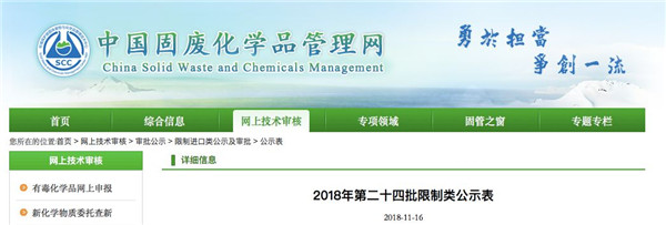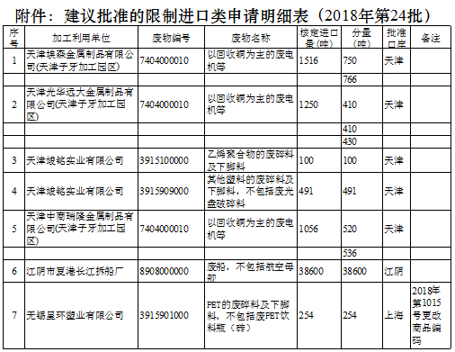 日前中國固廢化學(xué)品管理網(wǎng)發(fā)布了《建議批準(zhǔn)的限制進(jìn)口類申請明細(xì)表(2018年第24批)》,其中涉及30家企業(yè)具體內(nèi)容如下: