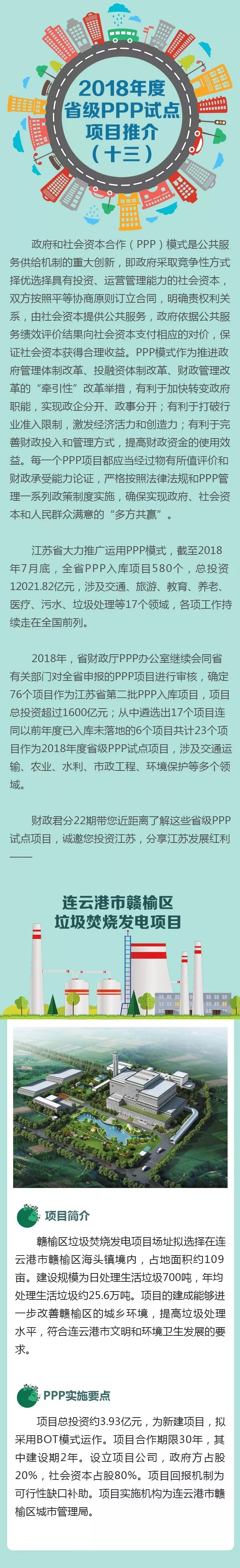 2018省級PPP試點項目推介之十三連云港市贛榆區(qū)垃圾焚燒發(fā)電項目2018省級PPP試點項目推介之十一新沂市生活垃圾焚燒發(fā)電項目原標(biāo)題:2018江蘇省級PPP試點項目推介(垃圾焚燒專場)